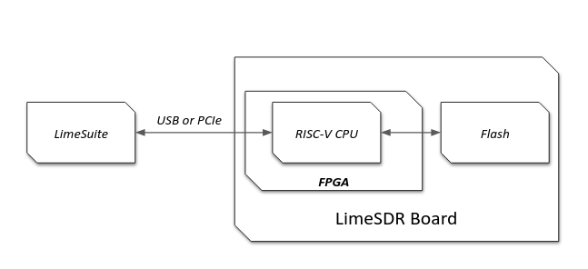 LimeSuite connects to the board over USB/PCIe and sends update commands along with bitstream data in segments.